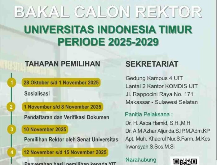 MAKASSAR, JIVANOTES– Jelang berakhirnya masa jabatan Rektor Universitas Indonesia Timur (UIT), Dr. Abdul Rahman, S.Pt, S.E, M.M, sivitas akademika kampus tersebut mulai menyuarakan aspirasi dan kriteria ideal untuk pemimpin baru.